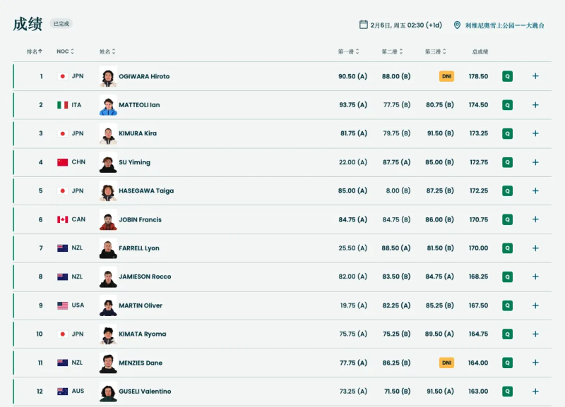 在北京时间2月6日结束的米兰冬奥会单板滑雪男子大跳台预赛中,卫冕冠军、中国选手苏翊鸣以总分172.75分的成绩,排名预赛第4位,成功晋级本届冬奥会单板滑雪大跳台决赛。本场预赛,苏翊鸣首跳发生失误,仅得到22.00分。不过作为卫冕冠军,大心脏的苏翊鸣及时调整状态,较为出色地完成后面2跳,分别获得87.75分和85.00分,成功逆袭进决赛。而由于2位队友杨文龙、...
